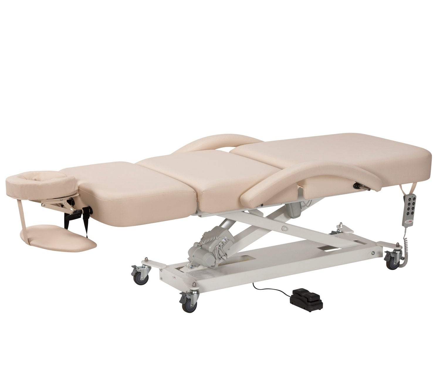 - Adjustable crescent shaped headrest and armrest included