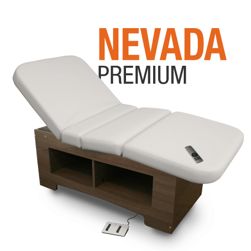 With a new polylac finish for its frame, available in a variety of six colors, the NEVADA PREMIUM is perfect for facial or body care treatments, hair removal, massaging and more. Sturdy, this table is highly stable, resting on four columns, one on each side The NEVADA PREMIUM features a crossbar for safety allowing to go up and down by using a foot pedal that keeps the therapist hands free, preserving the contact with the client during the treatment. The Nevada Premium provides a storage space for your supplies and may be ordered with a drawer or two. It also offers a great storage area for your towel warmer.